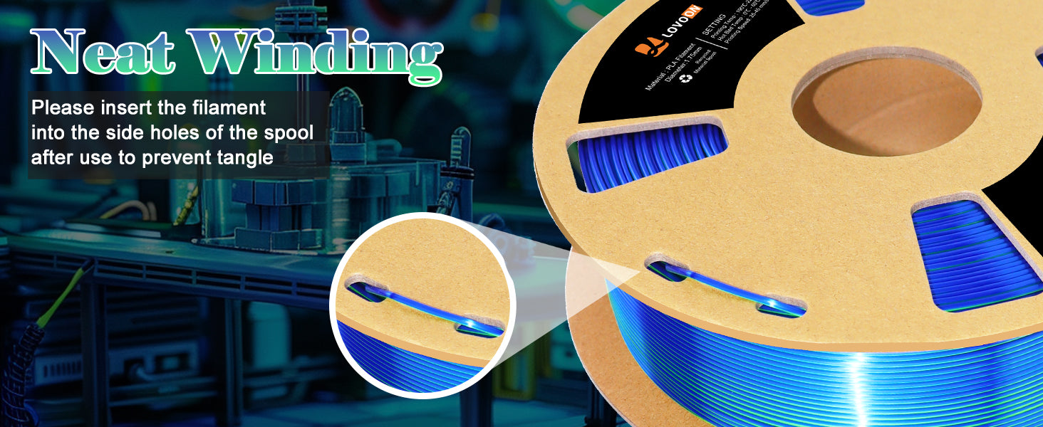- Reduzierter Geruch: Im Vergleich zu anderen Filamenttypen gibt dieses Seiden-PLA weniger Geruch ab und ist daher ideal für den Innendruck geeignet.