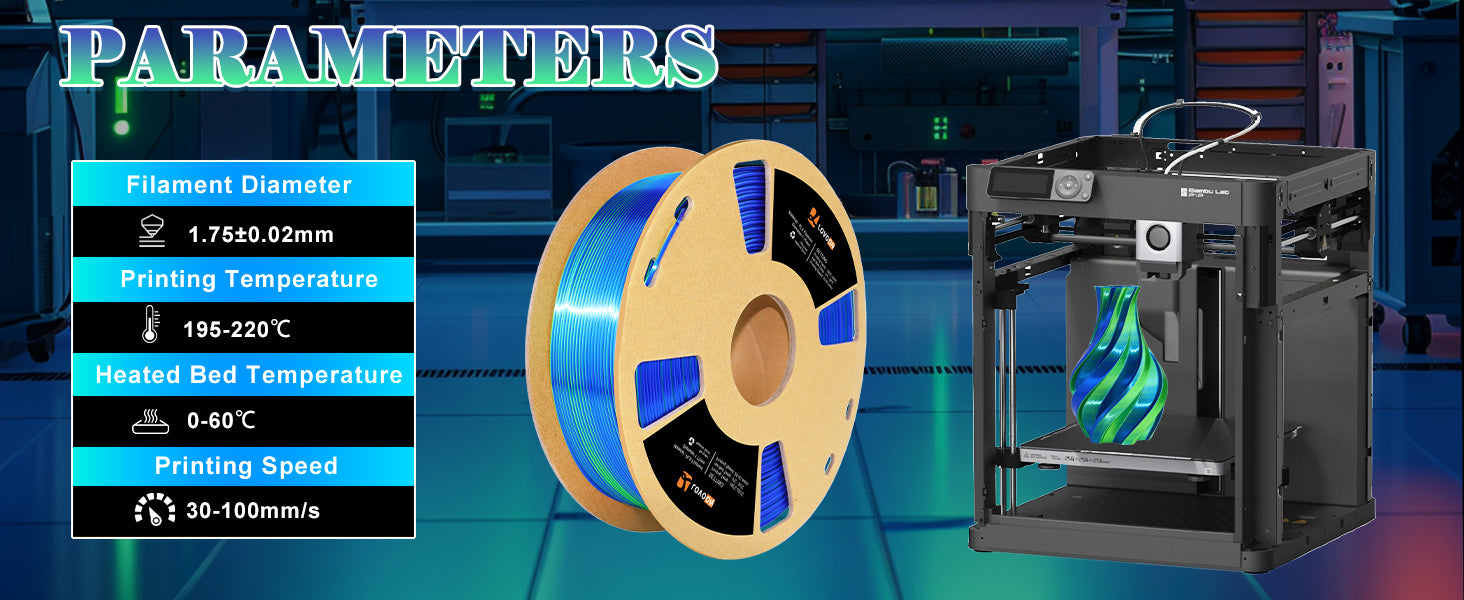 Unser Dual Color Silk PLA Filament basiert auf fortschrittlicher Technologie und bietet sowohl ästhetische als auch funktionale Vorteile. So erstellen Sie mühelos hochwertige Drucke. Die niedrige Viskosität des Filaments sorgt für eine gleichmäßige Extrusion, und seine thermische Stabilität garantiert eine einfache Steuerung der Drucktemperaturen für verschiedene Designs. Ob Hobby- oder Profidesigner – dieses Filament erfüllt und übertrifft Ihre Erwartungen und liefert mit jedem Druck außergewöhnliche Ergebnisse. Verbessern Sie Ihr 3D-Druckerlebnis noch heute mit unserem Dual Color Silk PLA Filament!