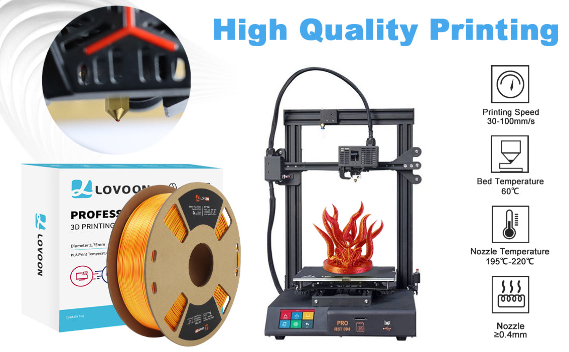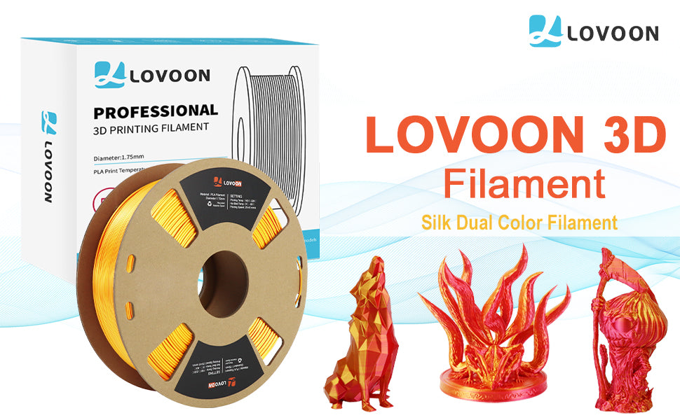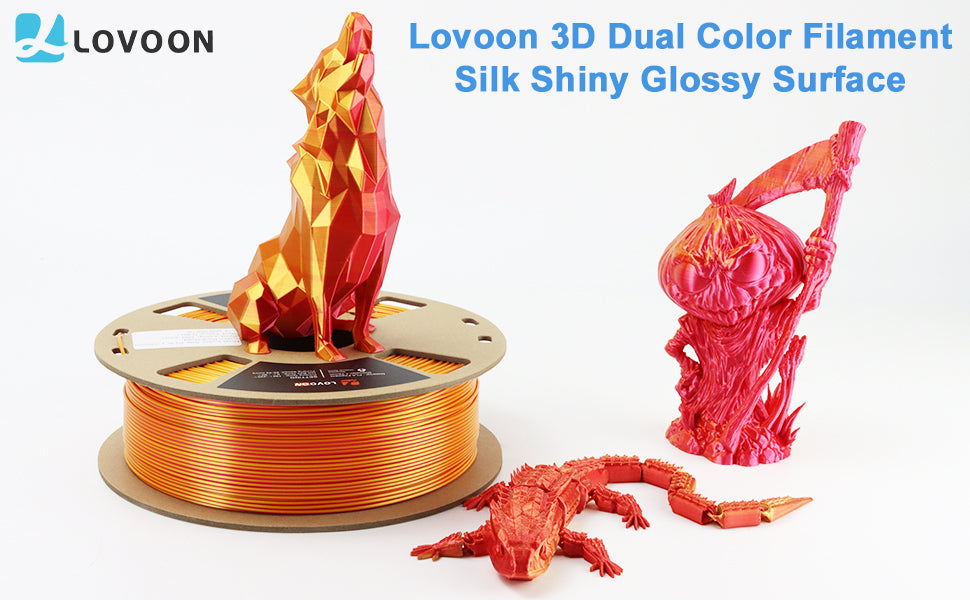 Im Vergleich zu Standardfilamenten auf dem Markt bietet das Dual Color Silk PLA Filament Gold-Rot ein dynamischeres und auffälligeres Finish. Frühere PLA-Filamentmodelle konzentrierten sich eher auf Einzelfarben, was oft zu weniger überzeugenden ästhetischen Ergebnissen führte. Dieses innovative Seidenfilament bietet eine reichhaltige, auffällige Textur und ermöglicht es Anwendern, komplexe Designs mit mehr Tiefe und Charakter zu erstellen.