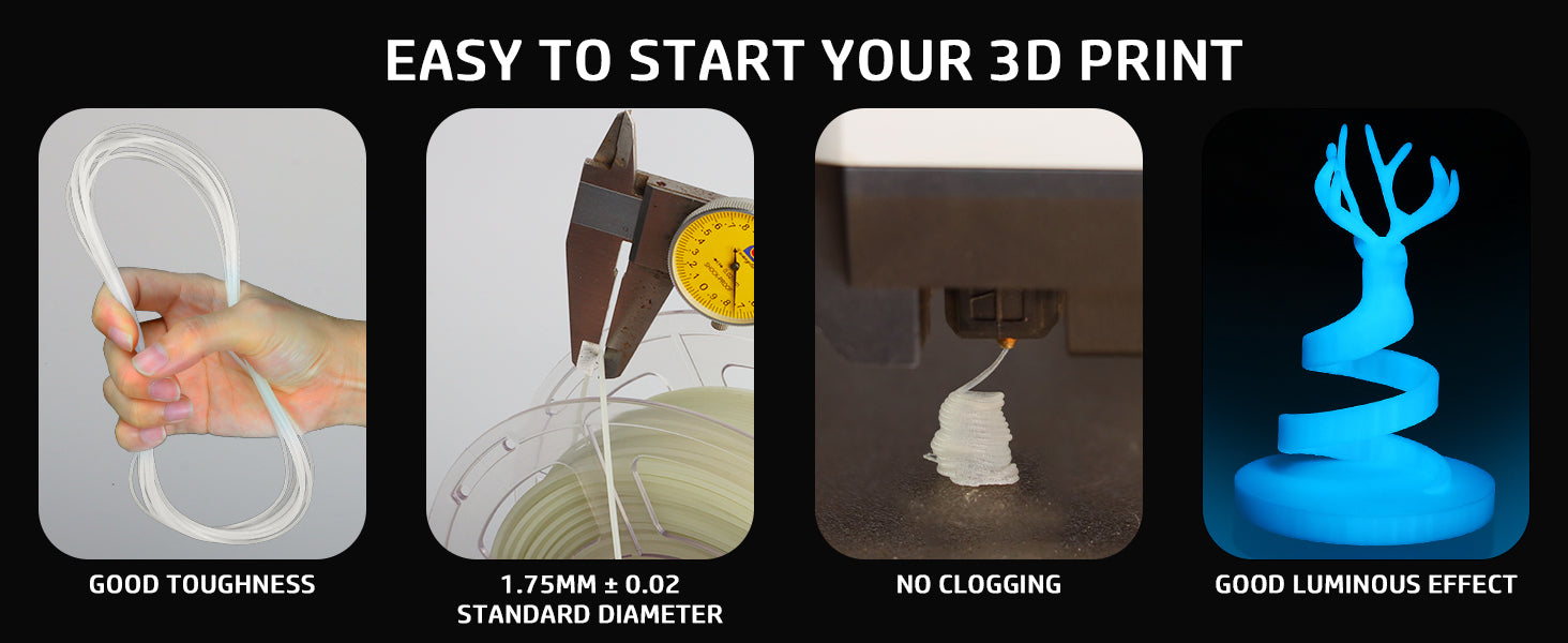 - Einfaches Drucken : Genießen Sie problemloses Drucken mit ausgezeichneter Schichthaftung und reduzierter Verformung, typische Probleme früherer im Dunkeln leuchtender Optionen.