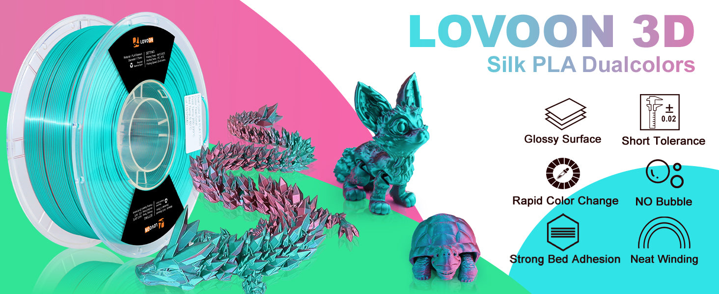 Elevate your 3D printing projects with the Dual Color Silk PLA Filament in Teal-Coral. This premium filament combines a stunning blue and pink finish with the eco-friendly properties of PLA, making it perfect for both hobbyists and professionals alike.