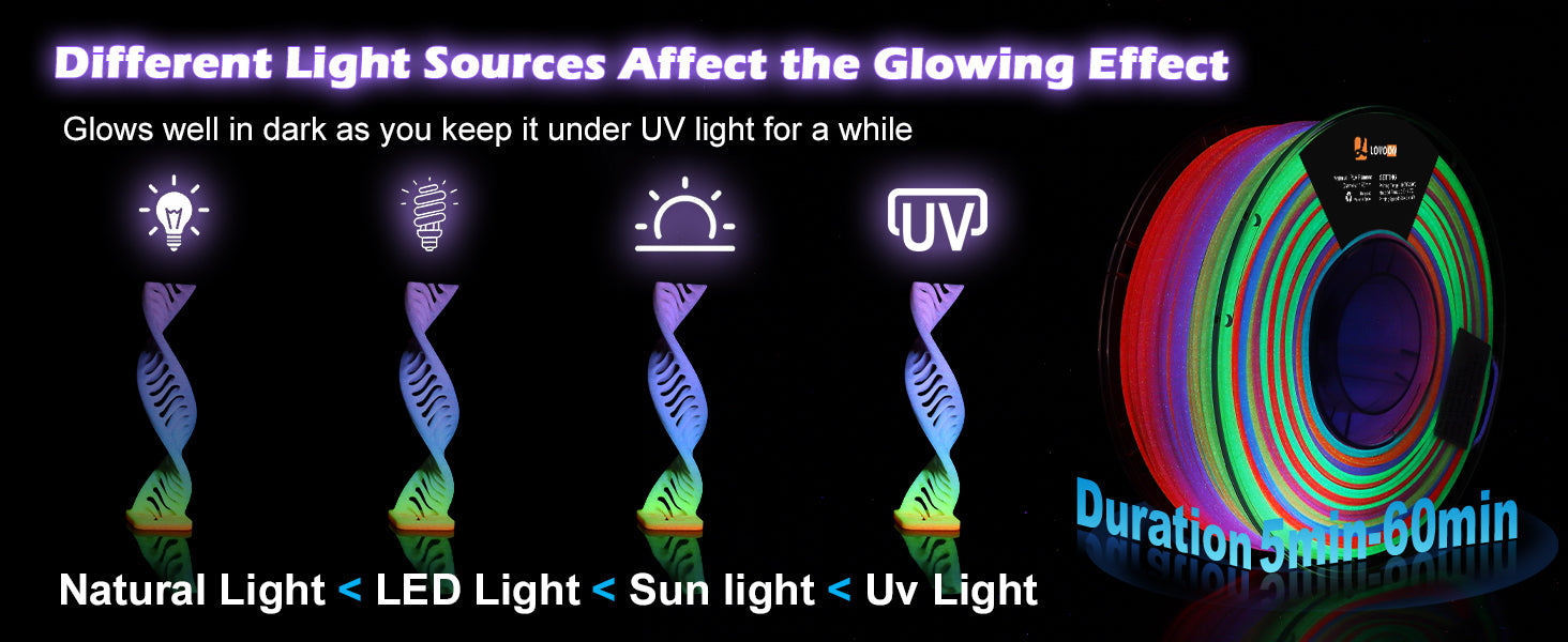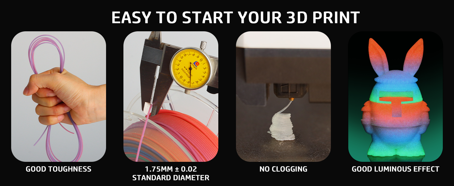 Key Technical Advantages: The Glow in the Dark Rainbow PLA Filament boasts impressive technology and performance that surpasses industry norms. The filament's specific formulation allows it to glow effectively for extended periods, making it ideal for decorative items, toys, and artistic displays. Its excellent adhesion and low shrinkage ensure that prints retain their detail and shape, while the easy-to-work-with nature of PLA makes it a favorite among users.