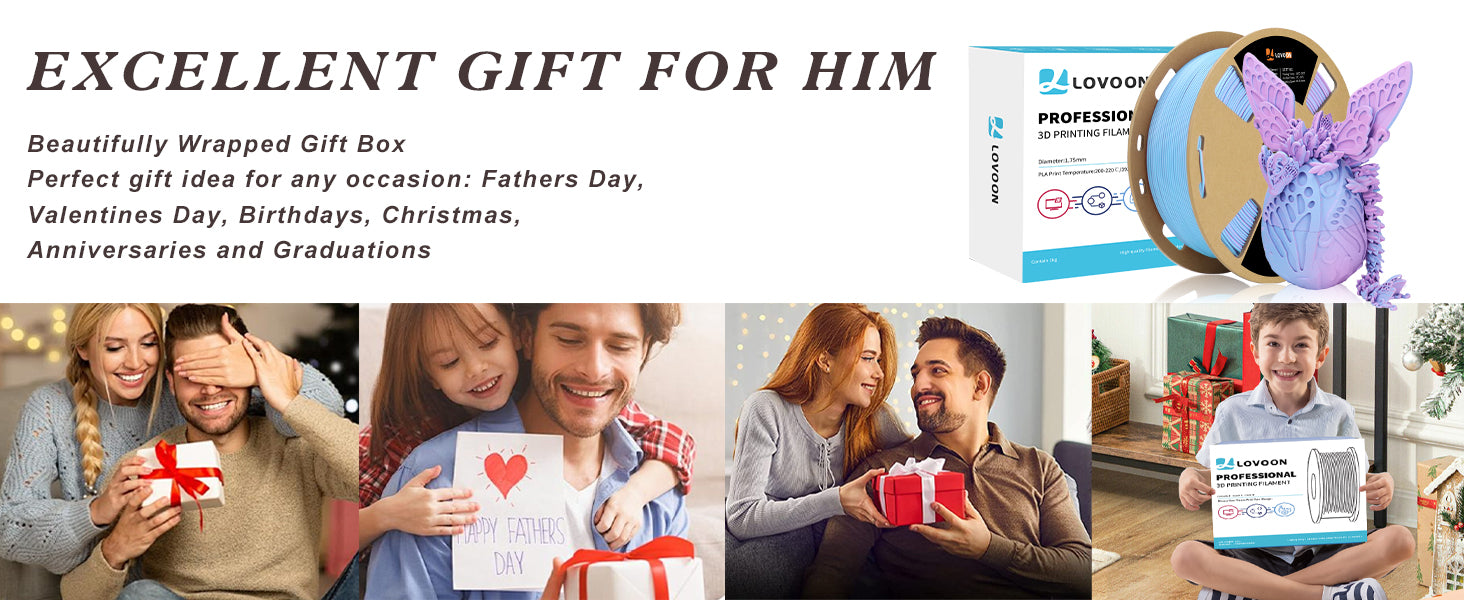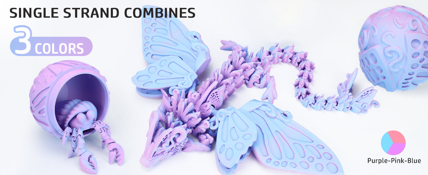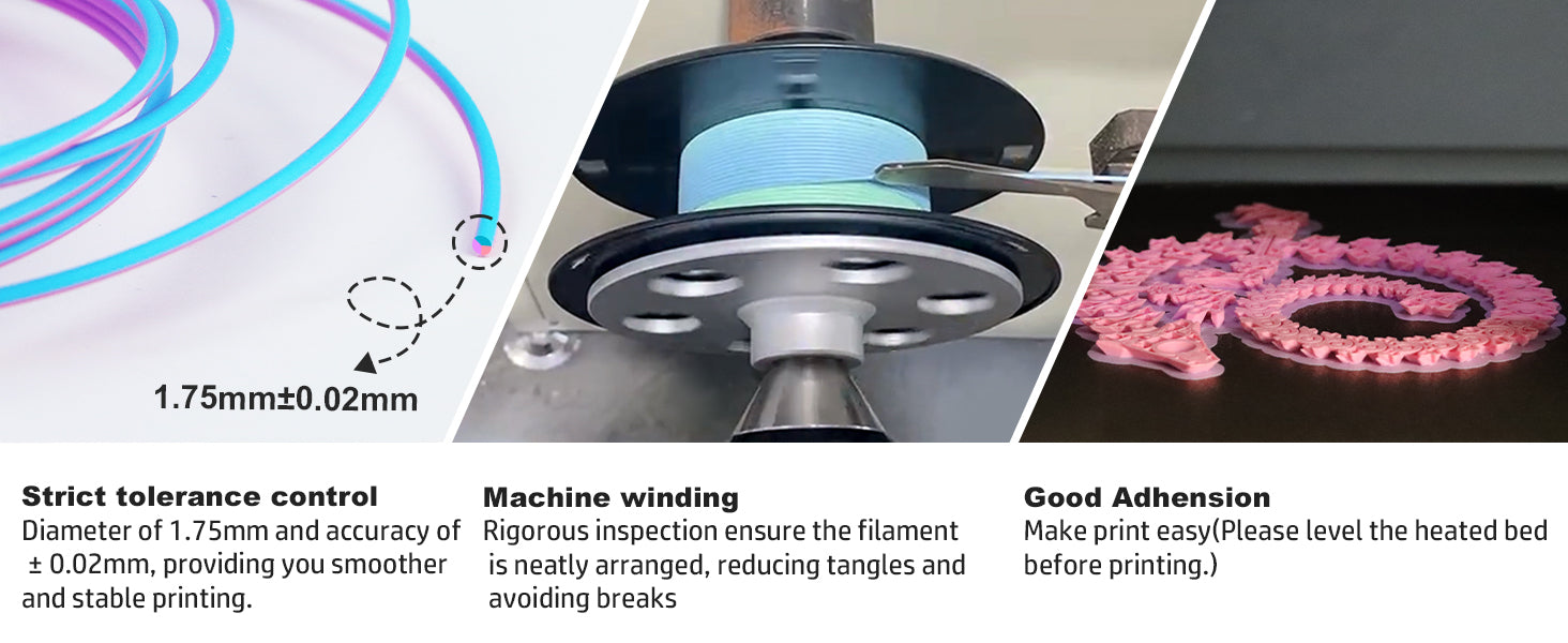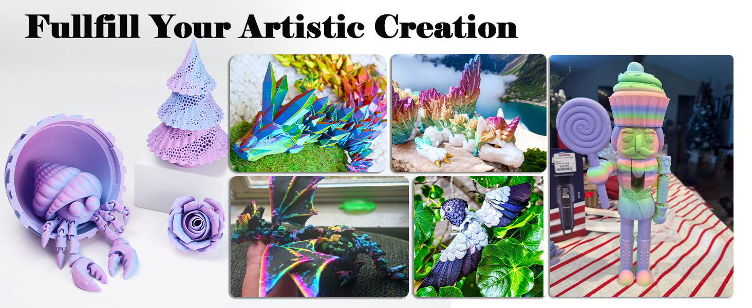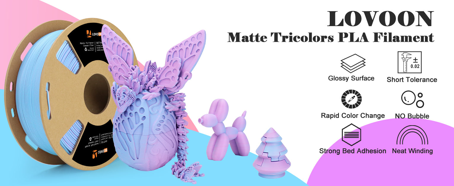 Compared to standard PLA filaments, our Matte Tricolor PLA Filament significantly elevates your prints. While traditional PLA filaments often showcase glossy finishes and solid colors, our unique tricolor design with a matte texture enriches the visual complexity. The smooth color gradient from purple to pink to blue not only enhances artistry but also minimizes sheen, making it a perfect choice for professional and hobbyist creators alike.