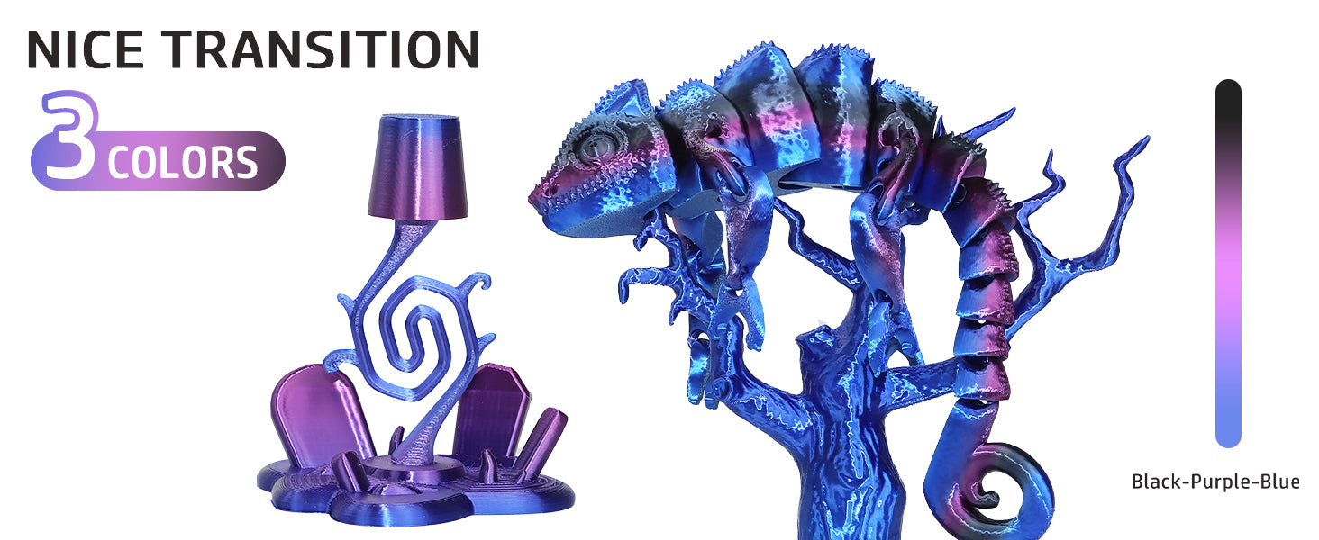 Unlock your 3D printing potential with our PLA Filament Black-Purple-Blue Gradient, expertly crafted for quality and versatility. This special gradient filament smoothly transitions from a deep black to a vibrant purple and finally a stunning blue, enabling you to create striking, multi-colored prints that stand out in any project.