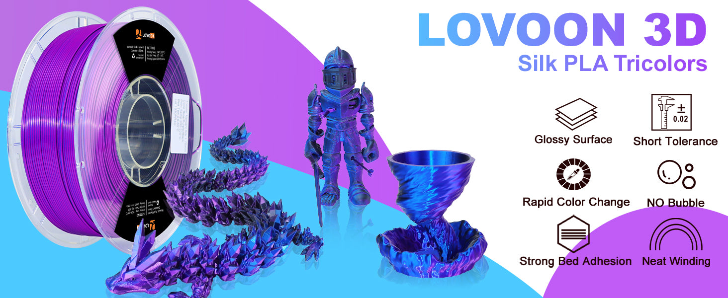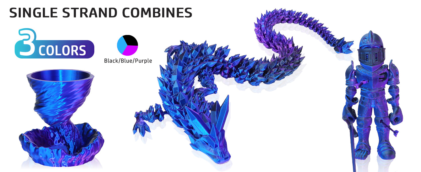 Discover the brilliance of the Tricolor Silk PLA Filament, designed to bring your 3D printing projects to life with a stunning sheen and a unique blend of colors. This premium filament combines vibrant blue, deep black, and rich purple, empowering you to create eye-catching designs with ease.