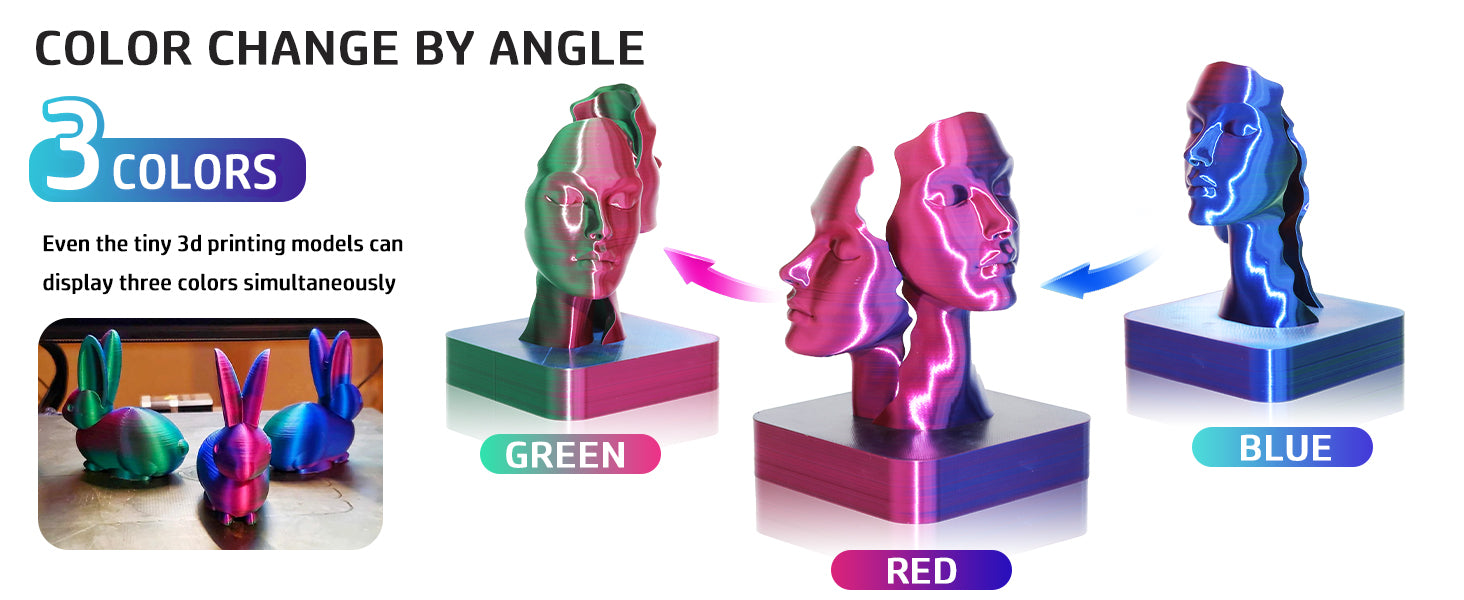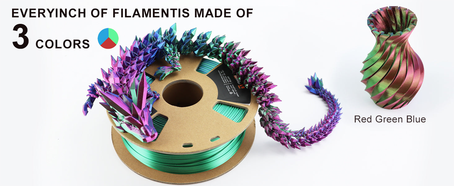 Explore new creative possibilities with our Tricolor Silk PLA Filament Green-Red-Blue, and watch your imagination come to life, one layer at a time. Whether you’re a seasoned professional or a budding enthusiast, this filament is your go-to choice for standout 3D prints that turn heads.